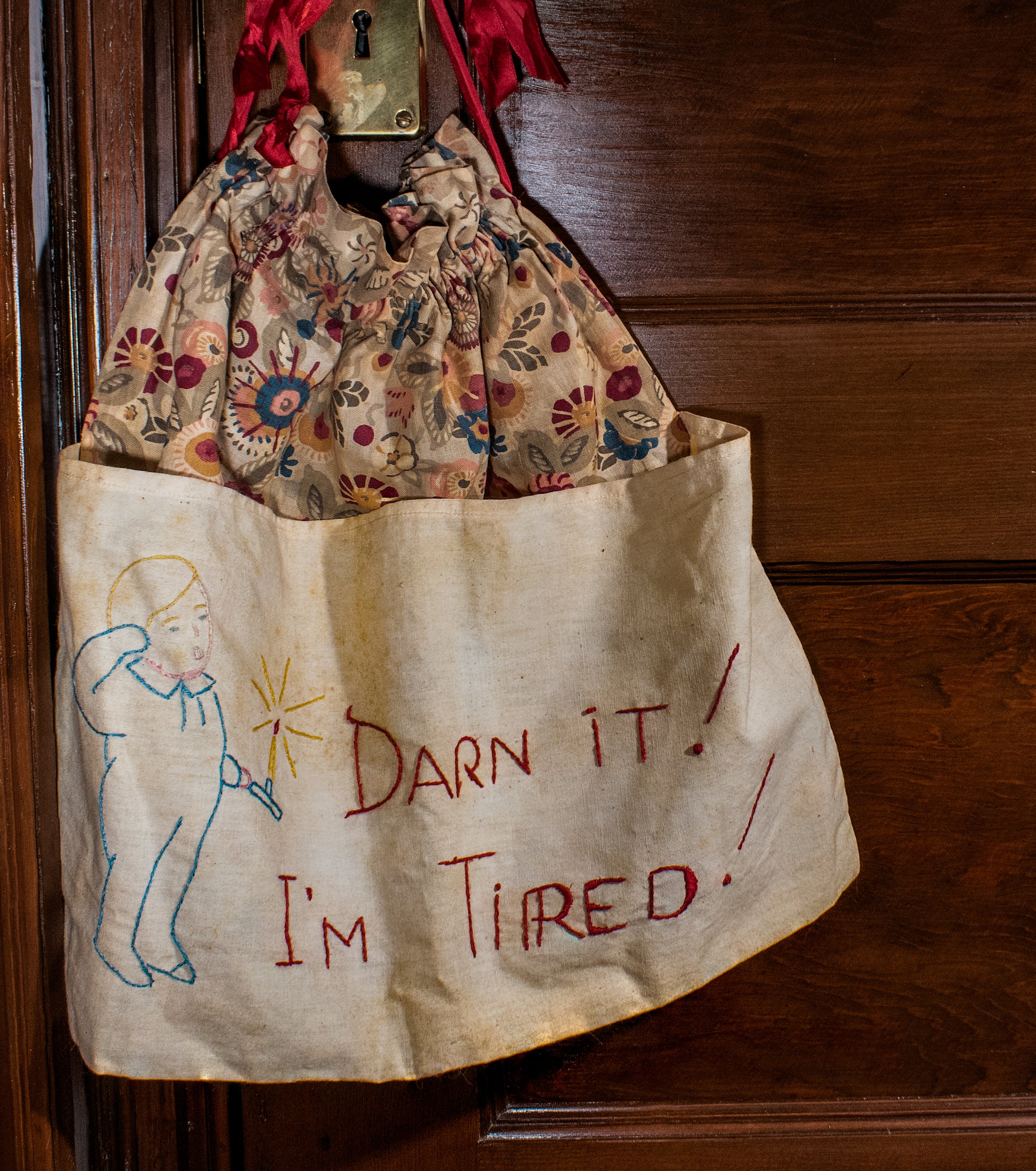 This is a wonderful handmade and embroidered darning bag. The drawstring bag is made from fabric with a fun floral print with colors of pink, cranberry, blues and greens and is cinched together with a red ribbon. There are deep outside pockets on the front and back for storing additional supplies. The front pocket features an embroidered image of a young boy holding a chamberstick with a lit candle, and has the text "Darn it! I'm Tired!"